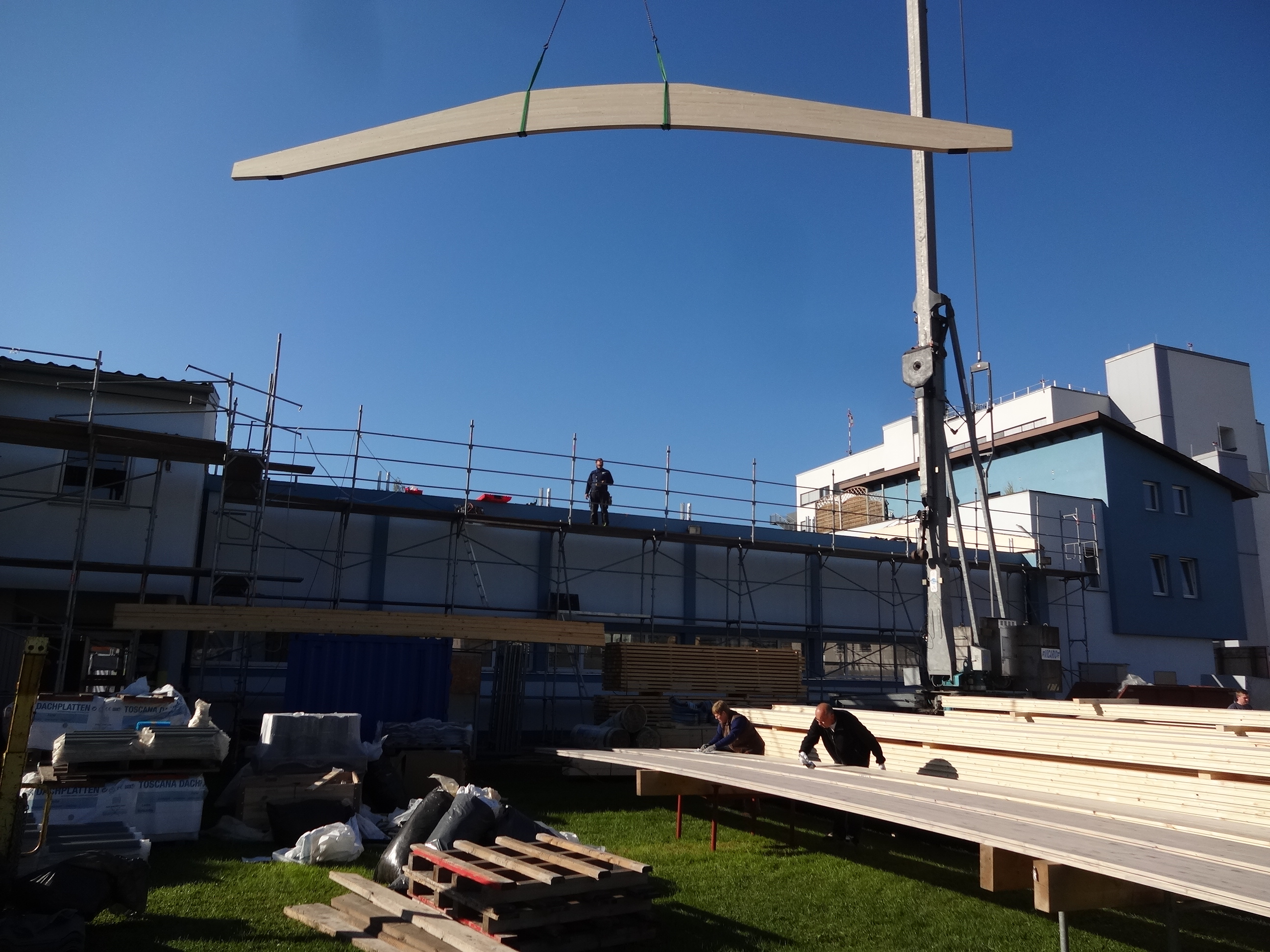 Die nächsten Arbeiten wurden von Professionisten ausgeführt. Diese umfassen am Vereinshaus: Verstärkung des Dachstuhls, Erhöhung der Dämmung und Aufbringung einer Vollschalung. Für das neue Dach der Turnhalle wurde die Firma Weißhaidinger aus Taufkirchen beauftragt. Dazu wurden die Nagelbinder abgebrochen und die Auflager für neue Binder errichtet. Die Montage der Leimbinder erfolgte in der KW 39. Eingedeckt wird die Halle mit einem Holzdeckensystem. Fleißige Turnerinnen haben im Vorfeld bereits für einen neuen Anstrich der Vordachschalung inkl. Sparren gesorgt.
